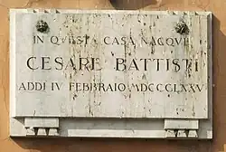 In seiner Heimatregion Trentino wurde Battisti 1920 mit anderen Protomartiri della Grande Guerra als Ehrenmitglied in die Accademia Roveretana degli Agiati aufgenommen.[9] Der Berg, auf dem er von den Österreichern gefangen genommen wurde, erhielt zum Ursprungsnamen Monte Corno den Zusatz Battisti.