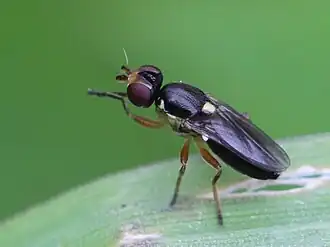 Die Fliegen erreichen eine Körperlänge von 3 bis 3,5 mm.[1][2] Auf dem gelben Kopf befindet sich ein großes schwarzes Ocellendreieck. Die Fühlerborsten (Arista) sind weiß. Halsschild und Hinterleib sind schwarz, das Schildchen gelb. Die Beine sind gelb, die Tibia etwas dunkler.