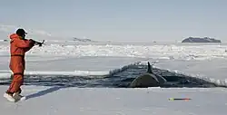 Ein Cetologe schießt einen Biopsie-Pfeil auf einen Schwertwal. Damit wird ein Stück Walhaut entnommen. Diese Entnahme ist für das Tier harmlos, da der Pfeil an ihm abprallt.