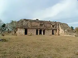 Die Fassade entspricht dem klassischen Puuc-Säulchenstil. Die untere Wandfläche oberhalb eines einfachen Sockels ist glatt und undekoriert. Die Eingänge sind teilweise mit zwei Säulen und aufliegenden Kämpferplatten ausgeführt. Das mittlere Gesims besteht aus drei Bändern, mit einem schlangenförmigen Motiv in der Mitte. Die obere Wandfläche zeigt Säulchen mit zwei Bindungen und in Abständen die Darstellung von Hauseingängen unter einem glatten Dach mit Verzierungen im oberen Teil. Gemeint sind hier möglicherweise – abweichend von dem üblichen Muster – Bauten mit glattem Steindach. Das obere Gesims ist ähnlich dem mittleren gestaltet, allerdings stehen aus dem mittleren Band hier zahlreiche kugelförmige Steine (Phalli?) heraus.