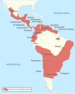 Die Chagas-Krankheit ist hauptsächlich in Mittel- und Südamerika verbreitet und wird durch den Kot blutsaugender Raubwanzen übertragen.[1] Die Raubwanzen infizieren sich auch gegenseitig durch Koprophagie und „Kannibalismus“. Ein Erregerreservoir (s. a. Zoonose) besteht u. a. bei freilebenden Tieren (z. B. Gürteltieren, Opossums, Zweifinger-Faultieren), aber auch bei Hunden, Katzen und Ratten. Auch der infizierte Mensch ist ein wichtiges Parasitenreservoir. Insgesamt soll es mehr als 18 Millionen Infizierte geben. In Bolivien könnte etwa ein Viertel der Bevölkerung betroffen sein. Jährlich gibt es 50.000 Neuinfektionen und 15.000 Todesfälle.[2]