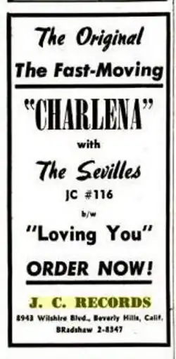 Der Titel erschien unter der Plattennummer 116 mit Loving You (Is My Desire) als Rückseite auf dem Label JC Records, bei welchem die Sevilles kurz zuvor einen Vertrag unterschrieben hatten. Der Chef des Labels war der in der Rock-’n’-Roll-Szene von Los Angeles umtriebige Produzent, Songwriter und Verleger John Marascalco, der das Stück auch bei seinem eigenen Musikverlag „Robin Hood Music“ publizierte. Entgegen seiner Gewohnheit, Erfolg versprechende Titel an national agierende Labels weiterzulizenzieren, behielt Marascalco Charlena im eigenen Haus.[1] In Kanada erschien Charlena auf Zirkon 1037, in Australien auf W&G 1161. Eine Wiederveröffentlichung kam 1963 auf Galaxy Records 721 auf den Markt.