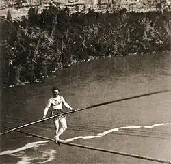 Berühmt wurde Blondin durch die Überquerung der Niagara-Schlucht auf einem Hochseil. Dazu ließ er in der Nähe der heutigen Rainbow Bridge ein 340 m langes, rund 8 cm starkes Seil in 50 m Höhe über die Schlucht spannen. Die Premiere der Überquerung erfolgte am 30. Juni 1859 vor rund 25.000 Zuschauern.[5] Es folgten mehrere weitere Aufführungen, oft ausgeschmückt durch verschiedene theatralische Variationen: mit verbundenen Augen, in einem übergestülpten Sack, eine Schubkarre rollend, auf Stelzen, einen Mann (seinen Manager Harry Colcord) auf dem Rücken tragend, auf halber Strecke sitzend, während er ein Omelett briet und aß,[2] oder auf einem Stuhl stehend, der nur mit einem Bein das Seil berührte[6].