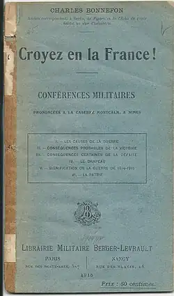 - Croyez en la France, six conférences militaires prononcées à la caserne Montcalm, à Nîmes: les causes de la guerre, conséquences probables de la victoire, conséquences certaines de la défaite, le drapeau, signification de la guerre de 1914–1915, la patrie. Berger-Levrault, 1915.