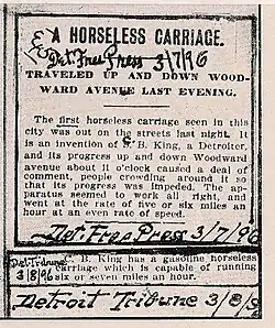 King war die erste Person, die in Detroit ein Automobil konstruierte, baute und vorführte.[7] Das Fahrzeug war ein Motor-Buggy mit einem Vierzylinder-Viertaktmotor, wie er sich später allgemein durchsetzen sollte.[8] Seine erste Fahrt über die Straßen von Detroit am 6. März 1896 schrieb Automobilgeschichte. Gefolgt von Henry Ford auf einem Fahrrad, fuhr King vor hunderten Zuschauern über St. Antoine Street und Jefferson Avenue über die Woodward Avenue und den Grand Boulevard und zurück nach Hause, wo er eine Busse erhielt wegen Störung der öffentlichen Ordnung. Nur drei Monate später hatte Ford sein Quadricycle soweit, dass auch er eine Probefahrt auf öffentlichen Straßen durchführen konnte.[9]