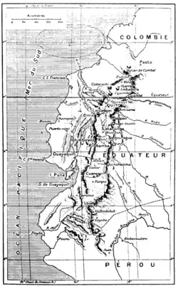 Karte von Ecuador mit dem Weg der Expedition von La Condamine über die Anden von Quito nach Cuenca