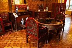 Auch Bildhauer sind vertreten, mit Werken von Guillaume Charlier, Emile Namur und Rik Wouters. Die Salons sind reich an Möbeln und dekorativen Kunstgegenständen aus der Zeit Ludwigs XV., Ludwigs XVI. und des Empire, an Wandteppichen aus Brüssel, Audenarde und Aubusson, an Teppichen, Porzellan und Goldschmiedearbeiten.[2]