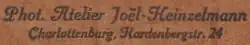 - ↑ Joël. In: Berliner Adreßbuch, 1918, Teil 1, S. 1201. „Joël – & Marie Hinzelmann[sic!], Charlotte, Atel. f. moderne Photogr, Charlottenbg., Hardenbergstr. 24 IV T. Steinpl. 2079 9–6“.