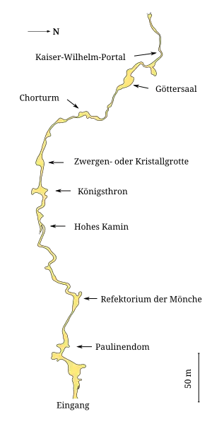 In der Höhle wird nach wenigen Metern eine größere Felsenhalle erreicht. Darin befinden sich die ersten Tropfsteine, wie der zwei Meter hohe und fast zwei Meter im Umfang messende Berggeist. Die Sihlerhalle ist nach dem Ersterforscher, dem Oberförster Hermann Sihler, benannt. Damals war der Berggeist noch strahlend weiß. Er hat heute durch Verunreinigungen eine viel dunklere Farbe. Der Weg macht anschließend einen Knick von fast 90 Grad, es folgt ein Trockengang mit dem Namen Vulkans Esse. Danach öffnet sich der Gang zu einer geräumigen Halle, in der vielgestaltige Tropfsteinformen anzutreffen sind. Sie heißt Paulinendom nach dem einzigen Kind des damaligen Königs Wilhelm II. Die nächste größere Halle, ebenfalls mit einer Vielzahl weißer Tropfsteine, nennt sich Elfenbeinkammer. Die Tropfsteine des darin befindlichen Schlösschens sehen wie Türme und Zinnen aus. Durch einen engeren Gang geht es wieder in eine größere, etwa 98 Meter vom Eingang entfernte Halle, das Refektorium der Mönche. Darin befinden sich viele Stalagmiten und vorhangartige Stalaktiten. Durch einen spitzbogenartigen Gangabschnitt geht es weiter zur Kanzel mit Kanzelredner, benannt nach den Bodentropfsteinen, die dort bis an die Decke gewachsen sind. Eine der schönsten Stellen der Höhle folgt 163 Meter nach dem Eingang mit der Schatzkammer. Darin befindet sich eine etwa drei Meter hohe Tropfsteinwand wie ein gefrorener Wasserfall. Bis dorthin drangen die Höhlenentdecker 1893 nach dem Wegräumen des Schuttberges am Eingang vor. Der einzige künstlich geschaffene Durchgang wird passiert. Danach geht es in einem etwas engeren Gang zum 222 Meter vom Eingang entfernten Hohen Kamin. An dieser Stelle zweigt ein Kamin etwa 14 Meter senkrecht nach oben ab. An seinem Ende befindet sich ein etwa 50 Meter langer, waagerecht verlaufender, mit zahlreichen Tropfsteinen ausgestatteter Gang, der jedoch bei der Führung nicht begeh- und einsehbar ist.[18]