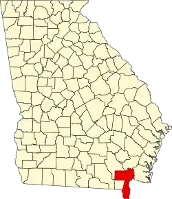 Das County liegt im äußersten Südosten von Georgia, grenzt im Osten an den Atlantik und im Süden an Florida. Es hat eine Fläche von 2028 Quadratkilometern, wovon sechs Quadratkilometer Wasserfläche sind, und grenzt im Uhrzeigersinn an folgende Countys: Brantley County, Camden County und Ware County.