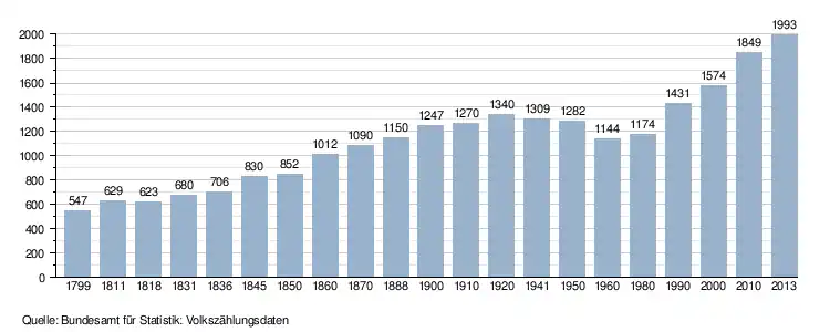 - ↑ Daten der Eidgenössischen Volkszählungen ab 1850 nach Gemeinden. (XLSX; 10 MB) Bundesamt für Statistik, Neuchâtel, 12. Juli 2024, abgerufen am 28. Juni 2025 (Öffnung in Excel nur über "Anhang/Excel-Datensatz" möglich).