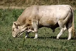 Charolais-Rinder sind einfarbig weiß bis cremefarben, ohne Pigmentflecken. Das Flotzmaul, Horn und Klauen sind hell.