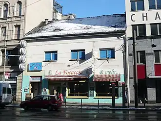 Das nur wenige Meter entfernte Baudenkmal des ehemaligen Volkskaffeehauses in der Chausseestraße 105 zeugt davon, dass die Chausseestraße bereits frühzeitig eine lebendige Geschäfts- und Vergnügungsstraße war.[47][48] Das von Alfred Messel entworfene und 1892 errichtete Haus wurde nach der politischen Wende unter Beibehaltung seiner markanten Fassade saniert.