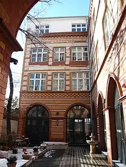 In den zwei geschlossenen Höfen des Geschäftshauses waren über die Jahre unter anderem ein Karosseriebauunternehmen, ein Elektromobil-Schnelldienst, eine Glockengießerei, die Zigarettenfabrik Karelli, eine Röntgenröhrenfabrik, die Osram Glühlampen GmbH, sowie später die Chemische Apparatefabrik Hanff & Buest, ein Radioladen und die Commerz- und Privat-Bank ansässig. Auch die Firma Konski & Krüger, Hauptproduzentin der Schlüsselmaschine Enigma, hatte ihren Sitz dort.[53]