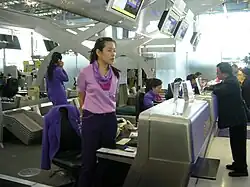 Große, internationale Fluggesellschaften unterhalten in großen Flughäfen eigene Schalter für verschiedene Arten von Fluggästen, z. B.: Luftfahrtpersonal, Reisegruppen, Standby oder Buchungsklassen (hier bei: Thai Airways in VTBS)