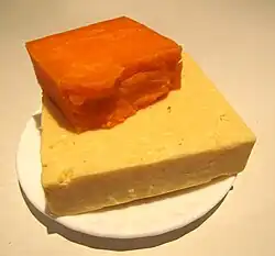 Cheddar ist ein Hartkäse, der in leicht unterschiedlichen Varianten produziert und angeboten wird[5][6]. Die klassische „Scottish Mild“-Variante kommt schon nach zwei bis drei Monaten in Blockform in den Handel, wohingegen traditionelle Hersteller den Käse bis zu zwei Jahre reifen lassen. In der klassischen Variante erhält Cheddar durch die Zugabe des geschmacksneutralen Pflanzenfarbstoffs Annatto eine charakteristische dunkelgelbe bis orange Farbe, wohingegen der ungefärbte traditionelle eher hellere Gelbtöne erhält.[1] Das Gourmet-Handbuch führt zur Einfärbung dieser und anderer britischer Käsesorten aus: