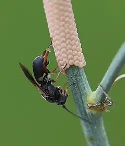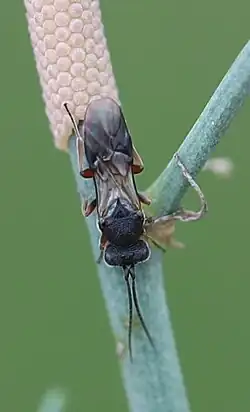 Chelonus cf. scabrator, Weibchen bei der Eiablage in einen Stängel | ||||||||||||