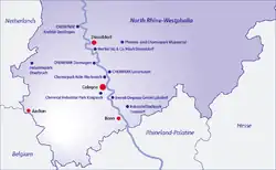 Nordrhein-Westfalen ist der wichtigste Industriestandort Deutschlands.[1] Die Chemiewirtschaft ist der umsatzstärkste Industriezweig des Landes Nordrhein-Westfalen. Vom gesamtdeutschen Jahresumsatz der chemischen Industrie wurden 2017 in der ChemCologne-Region (Regierungsbezirke Köln und Düsseldorf) 30,2 Milliarden Euro Umsatz und damit fast 70 % zum Gesamtumsatz der chemischen Industrie im Land Nordrhein-Westfalen oder rund 22 % des gesamten deutschen Chemieumsatzes generiert. Außerdem arbeiten über 70.000 Beschäftigte in der chemischen Industrie.[2] In der Region stehen mit dem Chempark an seinen Standorten in Leverkusen, Krefeld und Dormagen, dem Chemiepark Knapsack, dem Chemiepark Köln-Merkenich, dem Henkel-Standort in Düsseldorf, dem Evonik-Standort in Lülsdorf, dem Pharma- und Chemiepark in Wuppertal und dem Industriepark Oberbruch gleich neun leistungsstarke Ansiedlungsareale der chemischen Industrie zur Verfügung. Außerdem betreibt die Shell Oil Deutschland GmbH in Köln-Godorf und Wesseling die Rheinland Raffinerie, die größte Raffinerie Deutschlands.[3]