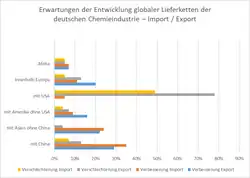 Als generelle Trends gelten Outsourcing und Globalisierung der Wertschöpfungsketten.[3] Als Handelspartner für Deutschland gewinnt China immer mehr an Bedeutung, da der Staat trotz steigender Produktion den eigenen Bedarf an chemischen Produkten nicht decken kann. Im März 2017 lag China diesbezüglich bei einem Defizit von 60 Milliarden Euro.[3] Der Trend zur Versorgungssicherheit der Chemieproduktion zu Chemie-Vertriebstandorten soll durch sogenannte Chemie-Hubs europaweit gewährleistet werden. Diese Hubs sollen als Konglomerat der Chemiestandorte oder als Lager und Umschlagspunkt mit ausgezeichneten logistischen Voraussetzungen verstanden werden. Momentan (2018) müssen aufgrund von inkompatiblen Bahn- und Straßennetzwerken, rechtlichem oder nicht vorhandenen Standards in Europa verzichtet werden.[3]