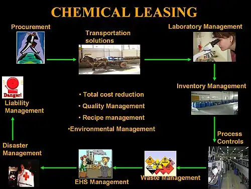Das Chemikalienleasing soll den Fokus von der Steigerung des Absatzvolumens der Chemikalien auf eine Dienstleistung verlagern. Es kann zu einer effizienteren Nutzung von Chemikalien und darüber zu ökologischen und ökonomischen Vorteilen führen. Treibende Kraft ist die Organisation der Vereinten Nationen für industrielle Entwicklung (UNIDO).[1]