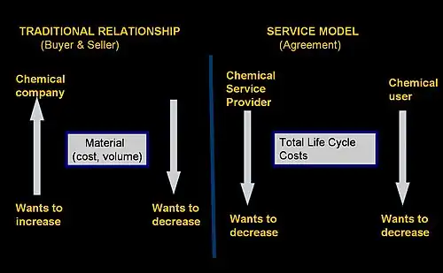 Der Produzent verkauft vor allem die Funktionen der chemischen und der funktionalen Einheiten. So sind z. B. die Anzahl der gemalten Stücke die Basis für die Zahlung.[2] Es ist ein Geschäftsmodell, in dem ein Kunde mit einem Dienstleister einen langfristigen Vertrag zur Lieferung und Verwaltung der chemischen und damit verbundenen Dienstleistungen eingeht.[3] Dieses Modell wird seit Jahrzehnten von der Lackindustrie praktiziert. Zum Beispiel wird das Markieren von Straßen oder Bürgersteigen oft auf der Grundlage der zu bedeckenden Kilometer, anstatt auf das Volumen oder die Masse der verbrauchten Farbe, abgerechnet.