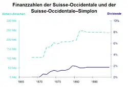 Die Aktien der fusionierten Bahngesellschaften wurden gegen solche der Suisse-Occidentale umgetauscht, wobei je nach Aktienkurs Zuzahlungen in Form von Obligationen im Gesamtbetrag von 14 Millionen Franken erfolgten. Das Kapital der Suisse-Occidentale setzte sich nach dem Abschluss dieser Finanztransaktion Ende 1876 aus 85 Millionen Franken Aktien und 102 Millionen Franken Obligationen zusammen. Die Central- und die Nordostbahn versuchten zusammen mit einer Bankgruppe erfolglos, die für den Ausbau des Netzes der Suisse-Occidentale erforderlichen Geldmittel zu beschaffen und eine Betriebsgemeinschaft zwischen den drei Bahnen zu bilden. Die Finanzierung erfolgte durch die «Société Suisse pour l’industrie des chemins de fer»[5], was die SO zu einer Neuorganisation der Verwaltung zwang. Deren Direktorium von vier Mitgliedern wurde 1875 durch einen einzigen Direktor ersetzt.