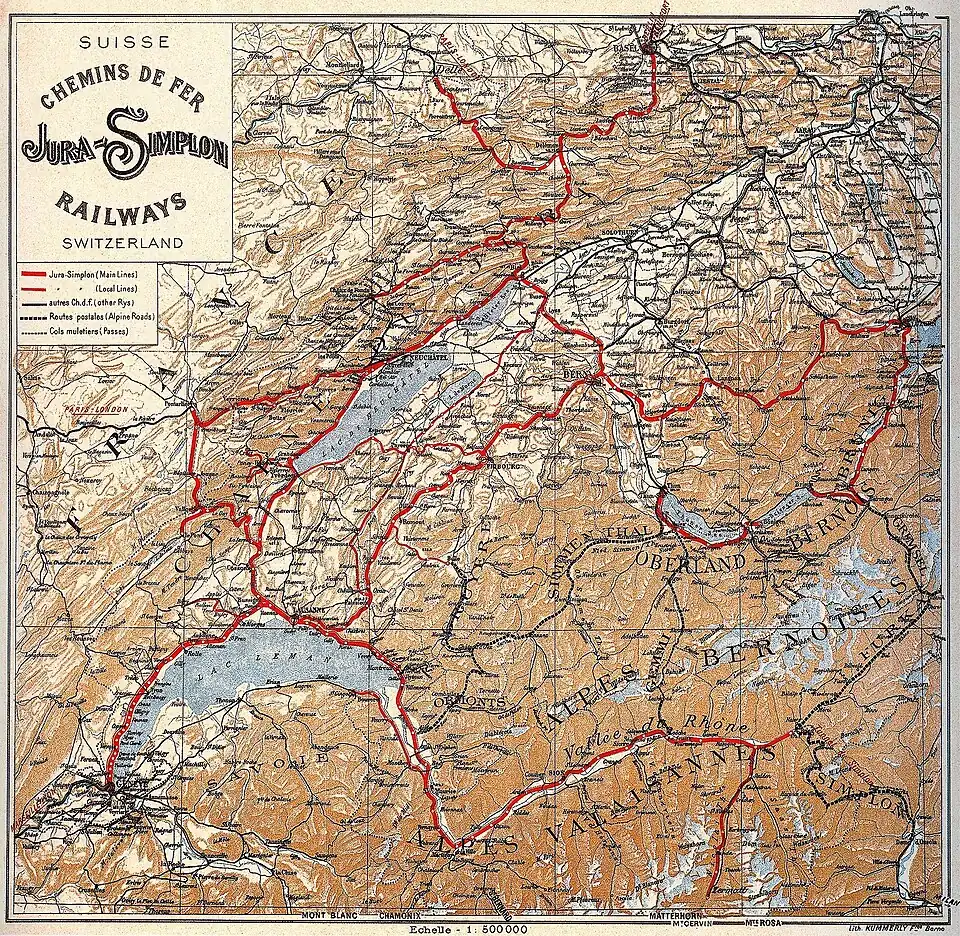 Die folgende Karte zeigt das Streckennetz Suisse-Occidentale–Simplon vor der Fusion mit der Jura-Bern-Luzern-Bahn (JBL):