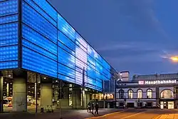 Die Fassade der Bahnsteighalle ist teilweise eine mit LEDs bestückte Medienfassade, und zwar an der Ecke Georgstr./Mauerstr.[6] Diese wurde bis November 2017 von der Künstlergruppe Random International mit der Installation Swarm Study/IX von 2016 bespielt.[7] Ab dem 2. November 2018 lief vorübergehend die Installation 13 Millionen Zustände von Antje Meichsner, Simon Hillme und Deborah Geppert und dem Studenten Carsten Nicolais (HfBK Dresden), im Rahmen der Chemnitzer Medienkunst-Biennale Pochen.[8][9]