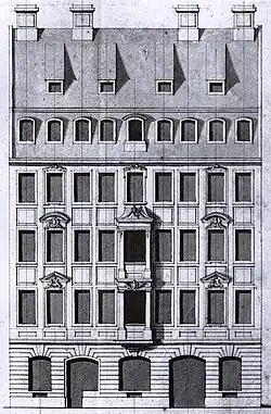 Da die zweite und achte Fensterachse ganz leicht aus dem Baukörper hervorzutreten scheinen, bezeichnet Hertzig diese wie auch die mittlere Achse des Hauses als „Risalitachsen“. Die Fenster dieser Achsen im dritten Obergeschoss wurden durch von Blütenketten umrahmte Muscheln bekrönt. Die Mittelachse wurde zusätzlich durch dorische und korinthische Pilaster verstärkt hervorgehoben, die auf Fotografien des 20. Jahrhunderts sichtbar sind, hingegen in der Zeichnung des 18. Jahrhunderts noch nicht vorhanden waren.