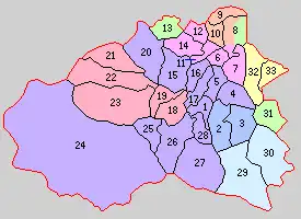Gliederung 1889, Gemeinden im 21. Jahrhundert in Flächenfarben![]() | |