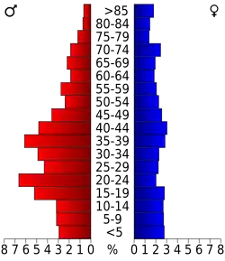 22,1 Prozent der Bevölkerung war unter 18 Jahre alt, 12,1 Prozent zwischen 18 und 24, 30,6 Prozent zwischen 25 und 44, 19,4 Prozent zwischen 45 und 64 und 15,8 Prozent waren 65 Jahre alt oder älter. Das Medianalter betrug 37 Jahre. Auf 100 weibliche Personen kamen 142,4 männliche Personen und auf 100 Frauen im Alter von 18 Jahren oder darüber kamen 149,5 Männer.
