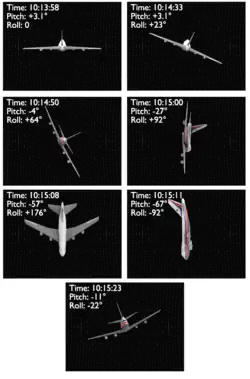 Die Maschine drehte sich mit 63 Grad auf die rechte Seite und ging in einen unkontrollierten Sturzflug über. Innerhalb von 112 Sekunden verlor die Maschine 20.500 Fuß (6300 m) Höhe. Die Beschleunigung erreichte 5,1 g; zugelassen war die Maschine für maximal 2,5 g. Durch diese Strukturüberlastung wurden beide Tragflächen bleibend verbogen, die Fahrwerksverriegelungen teilweise gebrochen und aus beiden Höhenflossen mehrere Meter abgebrochen (siehe Bild oben), das Hilfstriebwerk (APU) wurde aus der Verankerung gerissen.