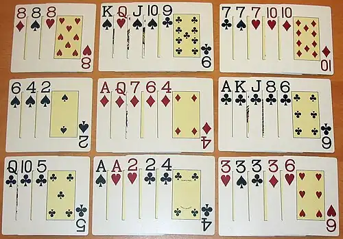 - Back Hand / Hinten: fünf Karten (muss besser sein als die Middle Hand)