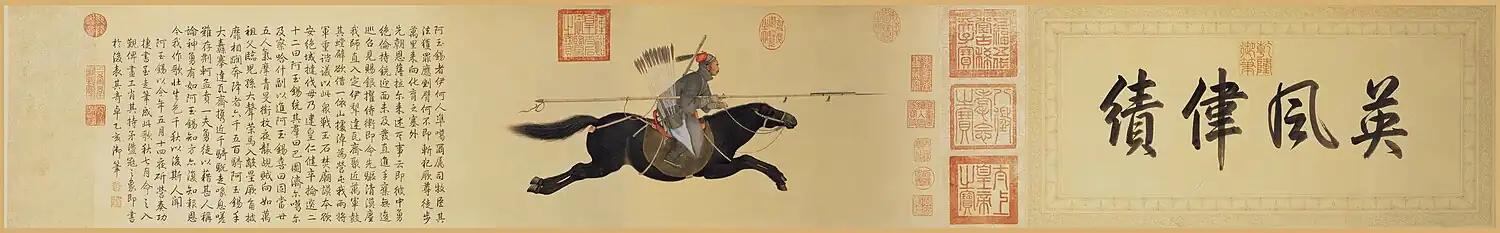 Der jesuitische Missionar Giuseppe Castiglione (* 1688 in Mailand; † 1766 in Peking) wirkte als Hofmaler unter drei Kaisern der Qing-Dynastie – Kangxi, Yongzheng und Qianlong. Er gilt als Begründer des Qing-Hofstils, in dem Elemente der chinesischen Malerei, mit dem Schwerpunkt auf Landschaftsmalerei, und der europäischen Malerei mit dem Schwerpunkt auf menschliche Porträts, zu einem eigenständigen Stil verschmolzen wurden.[2] Ein bekanntes Werk von ihm sind die Vier Afghanischen Rosse.