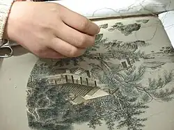 China war das erste Land, das Seide produzierte. Älteste in China gemachte Funde von zu Stoff gewebter Seide lassen sich in die Jungsteinzeit bis 6500 v. Chr. datieren.[1] Seidenstickerei war außerhalb der chinesischen Welt begehrt. Das alte China produzierte auch Stickereien auf Hanf, Ramie, Baumwolle und Kudzu-Fasern.