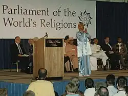 1993, zum hundertjährigen Jubiläum des Parlaments der Weltreligionen, wurde Chinmoy eingeladen, die Vollversammlung der Veranstaltung in Chicago mit einer stillen Meditation vor 6000 Delegierten und Menschen, die den interreligiösen Dialog pflegen wollten, zu eröffnen.[22] 2004 eröffnete er in Barcelona das Parlament der Weltreligionen nochmals offiziell mit einer Meditation.[23]