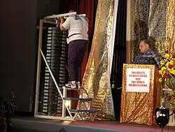 Sri Chinmoy (stehend) beim Heben von Gewichten