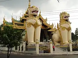 Der mit dem Chinthe verbundene planetarische Posten für Dienstag in der Shwedagon-Pagode. Im Hintergrund steht eine Manussiha-Statue. -