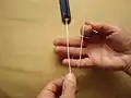 Der Chirurg hält den Faden zwischen Daumen und Mittelfinger während der Zeigefinger leicht abgespreizt ist. Mit einer rollenden Drehung der Knüpfhand legt er den Knüpffaden über den Zugfaden. Der Zeigefinger zieht den Zugfaden um den Knüpffaden. Während Daumen und Ringfinger den Faden fixieren, greift der Mittelfinger um. Dann ziehen Zeige- und Mittelfinger den Faden durch das Auge.[6]