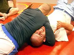 Ähnlich wie bei dem Guillotine Choke wird hierzu unter den Hals des Gegners gegriffen. Allerdings geschieht dies zum einen von vorne, also der Gesichtsseite her, nicht vom Hinterkopf, zum anderen wird nicht mit der freien Hand die zweite Hand verriegelt. Stattdessen entsteht dieser Effekt hierbei durch den Druck mit der Schulter. Die zweite Hand sollte genutzt werden, um die Hüfte des Gegners zu blockieren, um eine Entlastung des Nackens durch „Mitwandern“ und dadurch Verbesserung des Winkels zu vermeiden.[25]