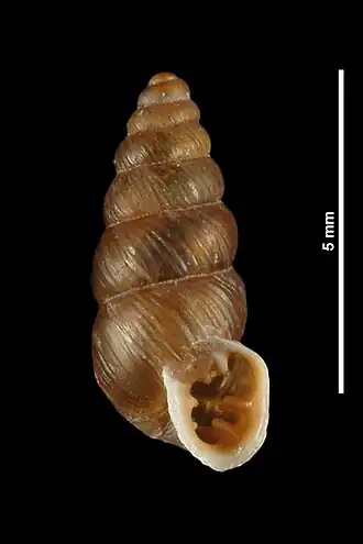 Das konische Gehäuse ist 5,3 bis 6,8 mm hoch und 2,3 bis 2,7 mm breit. Es besitzt etwa 6 bis 7 stark gewölbte Windungen. Die Oberfläche ist auf den postembryonalen Windungen regelmäßig mit groben und stumpfen Rippen versehen; die Rippen können auf der letzten Windung etwas unregelmäßiger werden. Der Mündungsrand ist nur sehr wenig umgeschlagen, und meist stark verdickt (jedoch nicht schwellenartige verdickt). Die Mündungsbewehrung besteht aus meist sieben (bis zu neun) Zähnen. Die Spiralis ist mit der Angularis verbunden. Im Parietalbereich ist eine Parietalis ausgebildet. Die Columellaris ist immer kräftiger entwickelt als die Infracolumellaris. Im Gaumenbereich sind immer eine Palatalis superior und eine Palatalis inferior; oft kommt auch eine kleine Suprapalatalis hinzu, seltener noch eine Infrapalatalis. Die Gaumenfalten sind gegenüber dem Spindel-/Nackenzähnen leicht zur Basis des Gehäuses hin verschoben. Das letzte Viertel der letzten Windung ist schwach schief abgeflacht, Basis des Gehäuses ist jedoch nicht gekielt. Das Gehäuse ist hell hornbraun gefärbt, die Schale durchscheinend.
