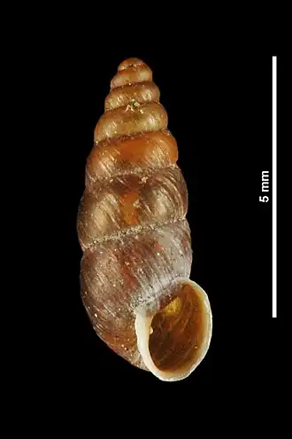 Das schlank-kegelige Gehäuse ist 4,9 bis 6,3 mm hoch und 2,1 bis 2,4 mm breit. Die 6 bis 7 mäßig gewölbten Windungen sind unregelmäßig gestreift. Die Mündungsbewehrung ist weitgehend reduziert. Es ist nur eine mehr oder weniger kräftige Columellaris vorhanden. Gelegentlich ist noch eine sehr schwach ausgebildete Parietalis angedeutet. Der Mündungsrand ist nur unwesentlich durch eine weiße Lippe verdickt, die auch nicht schwellenförmig angelegt ist. Die Basis der Mündung ist nicht U-förmig gerundet, sondern ist in der Frontalansicht schief V-förmig; die Gaumenseite ist leicht abgeflacht. Im Bereich der (nicht vorhandenen) Infrapalatalis ist bei einigen Gehäusen eine kurze Einkerbung vorhanden.