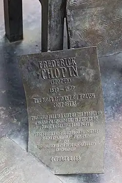 Die Inschrift in Großbuchstaben, die sich auf einem neben Chopins Stuhl am Boden befindlichen Blatt Papier befindet lautet: „FREDERICK/CHOPIN/(Szopen)/1810–1849/The Most Eminent of Polish/Composers/This Sculpture is a Gift of the People of/Poland to Singapore, in Memory of/Music's Greatest Tone Poets/Made Possible by the Generous Support of:/Halina and Miroslaw Pienkowski/and/the Embassy of/the Republic of Poland/in Singapore/October 2008“ (Der bedeutendste polnische Komponist. Diese Skulptur ist ein Geschenk der Menschen in Polen an Singapur. In Erinnerung an den größten Tondichter, ermöglicht durch die großzügige Unterstützung von: Halina und Miroslaw Pienkowski und die Botschaft der Republik Polen in Singapur, Oktober 2008).