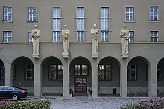 Das nach Plänen von Architekt Franz Sturm errichtete Gerichtsgebäude wurde in den Jahren 1930 bis 1933 als Symbol für eine unabhängige Justiz erbaut. An der Fassade befinden sich vier überlebensgroße Figuren, die verschiedene Funktionen im Rechtssystem darstellen: einen Richter, einen Staatsanwalt, den Gesetzgeber und einen Rechtsanwalt. Die beiden inneren Figuren stammen von Christa Vogelmayer, während die beiden äußeren von Josef Horak geschaffen wurden.[8]