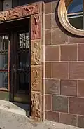 Zwei Natursteinreliefs mit Darstellungen von spielenden Kindern und Delfinen an einer Hausfassade.[10]
