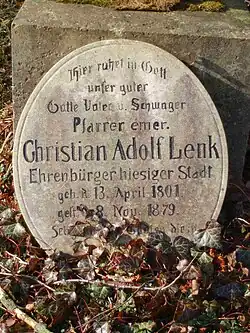 Christian Adolf Lenk, eigentlich Christian Adolph Lenk, (* 1. Januar[1] oder 13. April[2] 1801 in Zschorlau; † 8. November 1879 in Johanngeorgenstadt) war ein deutscher Diakon und evangelischer Pfarrer. Er ist Ehrenbürger von Johanngeorgenstadt.[3]