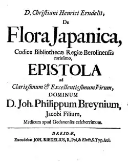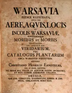 - ↑ Warsavia physice illustrata: sive, De aere, aquis, locis et incolis Warsaviae, eorundemque moribus tractatus. Cui annexum est viridarium, vel catalogus plantarum circa Warsaviam nascentium … Christian Heinrich Erndl, Apud Joh. Christoph. Zimmermanni haered. & Joh. Nicol. Gerlachium, 1730.