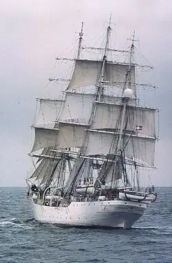 - Rigg: Vollschiff, doppelte Mars- und einfache Bramsegel, Royals; Masten mit Mars- und Bramstengen