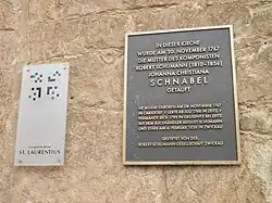 Am 4. Februar 1836 verstarb Christiane Schumann in Zwickau. An der evangelischen Kirche St. Laurentius in Karsdorf, in der sie am 30. November 1767 als Johanna Christiana Schnabel getauft worden war, ließ die Zwickauer Schumann-Gesellschaft 2012 ihr zu Ehren eine Gedenktafel anbringen.[22]