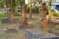 Terrakotta-Stelen, die im Bereich der Straßenbahnhaltestelle Poliklinik (heute: Polikum) aufgestellt wurden.[5] - 2002/2003: Hahn als Rufer, Letschin.